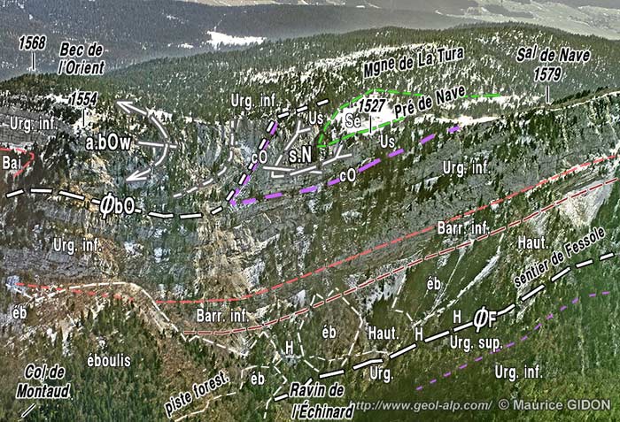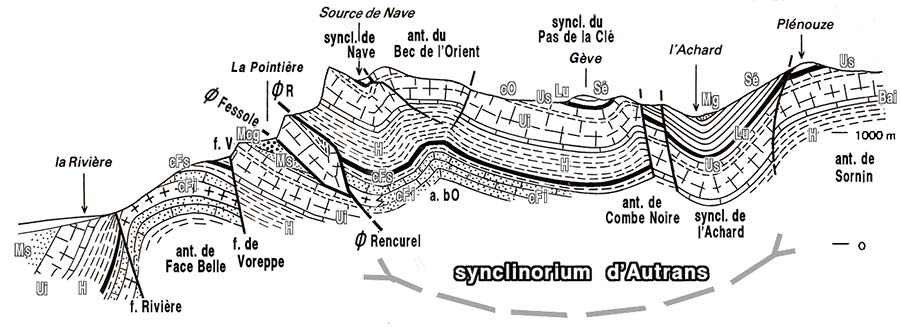Sous ce dernier angle il apparaît clairement que la bordure occidentale du synclinorium d'Autrans se fronce par un enchaînement de charnières, anticlinal du Bec de l'Orient et synclinal de Nave, avant de prendre le pendage de l'ordre de 30° vers l'est qu'il conserve tout du long de cette bordure vers le sud jusqu'au delà des gorges de la Bourne (voir la page "Bourne amont") .