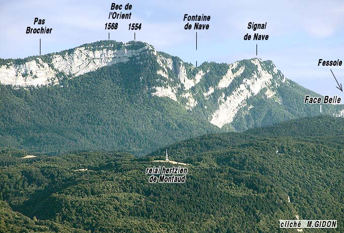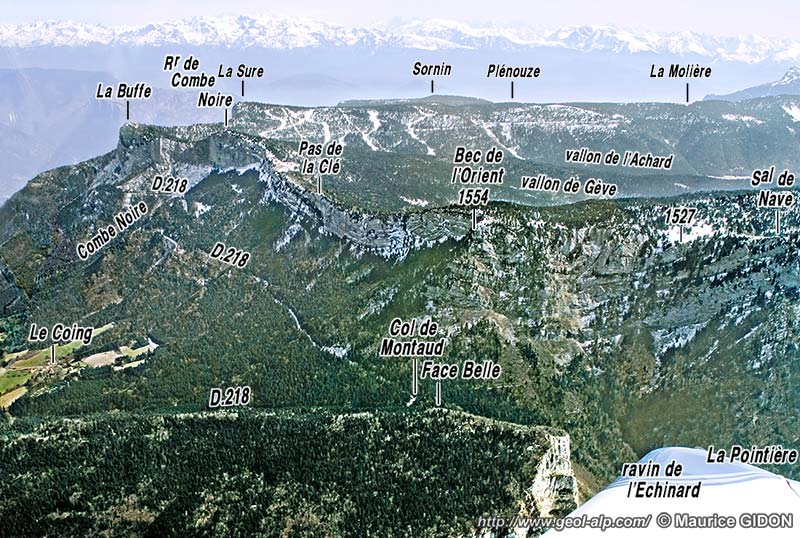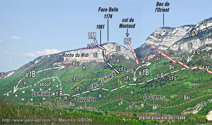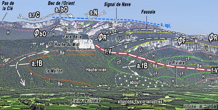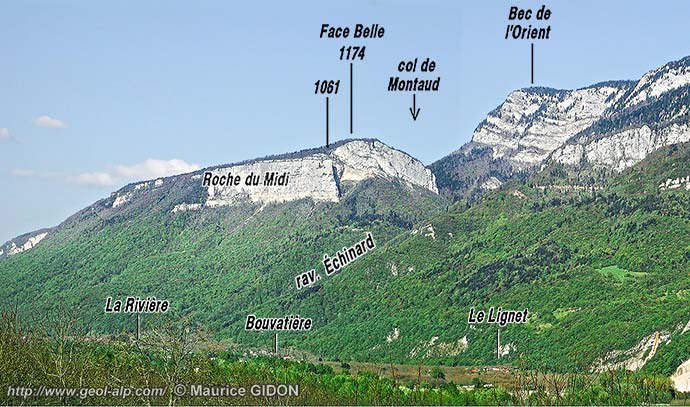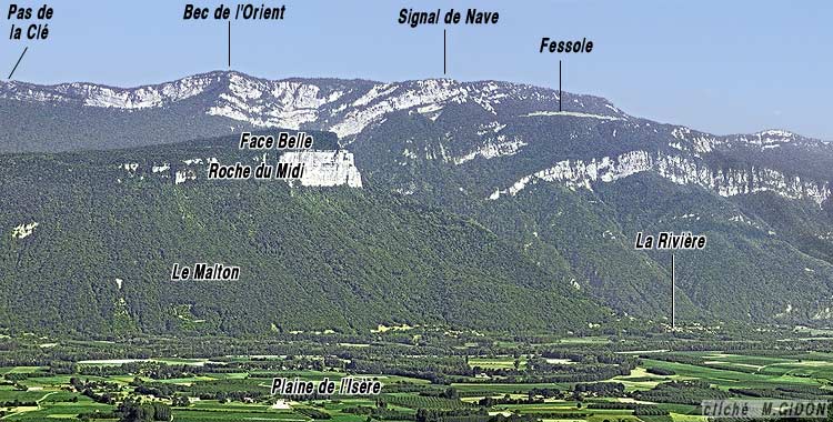 Au sud de Saint-Quentin la bordure de la plaine de l'Isère, orientée presque EW s'infléchit vers le sud, en sens anti-horaire, pour prendre à partir du village de La Rivière, une direction plus proche de N-S. Cette inflexion du versant se fait progressivement en contournant le pied de la lourde échine boisée de Face belle, typique mont jurassien qui porte le village de Montaud (voir la page "Montaud"). Dans les pentes supérieures, à partir de l'épaulement du sommet de Face Belle, cette inflexion du versant est par contre brutale, puisqu'à l'est du Col de Montaud, au Bec de l'Orient, la barrière supérieure, orientée presque N-S, des falaises limitant les plateaux du Vercors occidental (voir la page "Écouges") se termine par un coude de l'ordre de 70°, à l'est duquel elle s'oriente presque W-E (voir la page "Buffe").