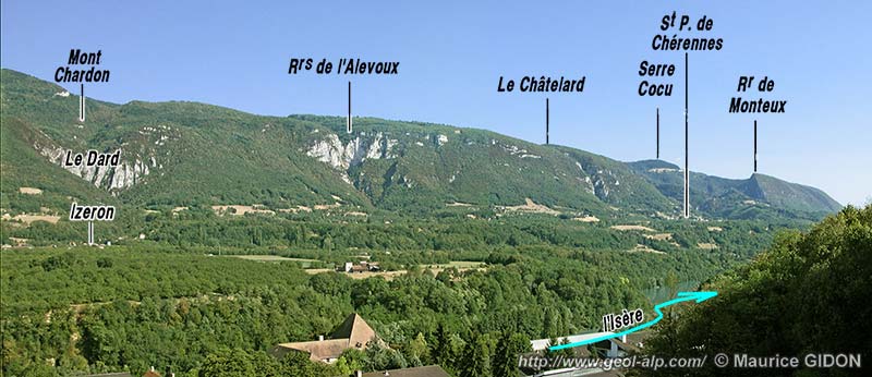 ![]() Coupe transversale aux plis, entre Cognin et le col de Romeyère. f.mC = faille de Mont Chardon ; f.M = faille de Marandière ; ØB = chevauchement des Belles ; s.M = synclinal de Moléron ; f.C = faille des Combes. |