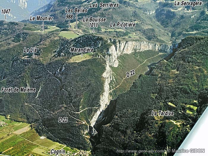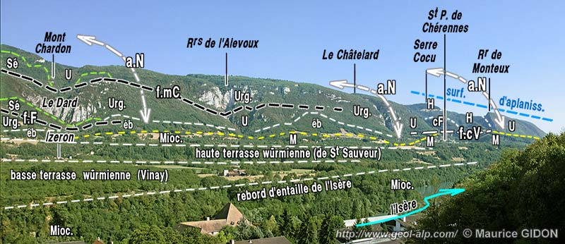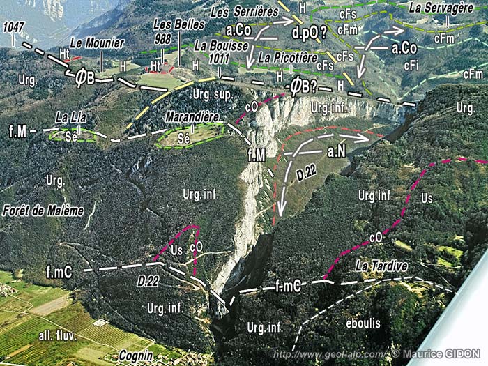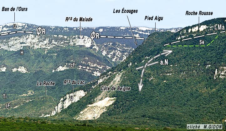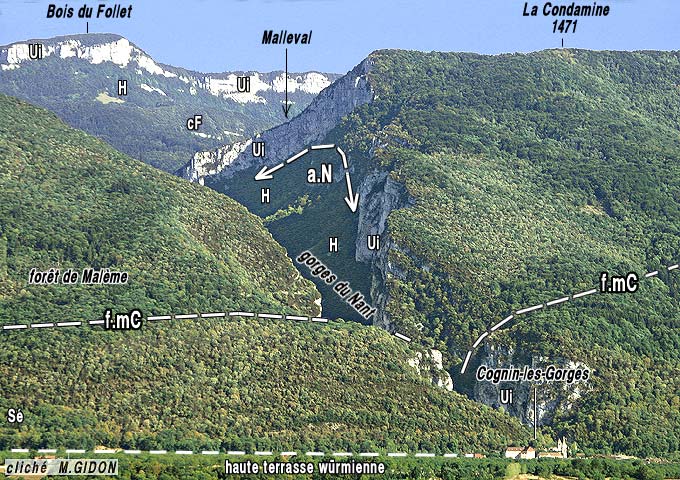 ![]() Les gorges du Nant vues du nord-ouest, depuis les coteaux dominant Beaulieu (rive droite de l'Isère) a.N = anticlinal du Nant ; f.mC = faille de Mont Chardon. Noter le relief extrêmement conforme* de part et d'autre des gorges : il résulte de la simple dénudation du sommet de la carapace urgonienne ployée par l'anticlinal. |