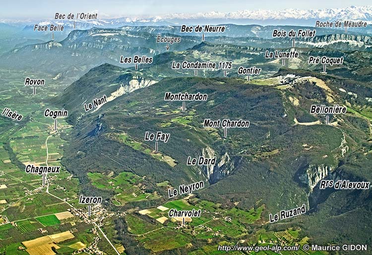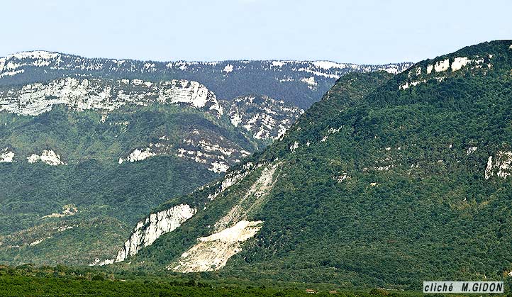 Du côté oriental, au nord des gorges la carapace urgonienne de l'anticlinal du Nant s'enfonce, par le jeu du chevauchement des Belles, sous les calcaires du Fontanil du coeur de l'anticlinal des Coulmes (voir la page "Malleval"). Le contraste est frappant entre le relief très conforme, en mont jurassien* typique, dessiné par la carapace urgonienne de l'anticlinal du Nant et la large combe anticlinale de Malleval, dont le relief est au contraire du type "inversé"*.