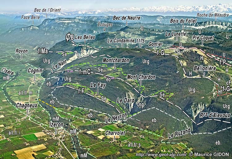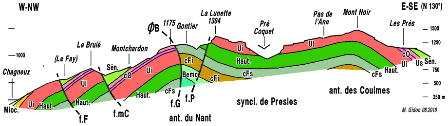 Coupe transversale aux plis, peu au nord d'Izeron et peu au sud de Malleval. f.F = faille du Fay ; f.mC = faille de Mont Chardon ; f.G = faille de Gontier ; f.P = faille de Presles ; ØB = chevauchement des Belles. |