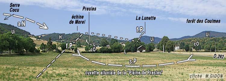 ![]() Le fond de la cuvette de Presles, vu d'enfilade, du sud, c'est-à-dire selon son allongement, depuis les abords est du hameau du Gazon Sous le colmatage alluvial sortent des pointements de Lumachelle, qui repose directement sur les couches à Orbitolines au village même (et supportent même un peu de Sénonien sous l'église) a.N = anticlinal du Nant (flanc oriental); s.P = synclinal de Presles. Le décalage du tracé de la faille entre Presles et le sommet de La Lunette (extrémité nord-ouest de la Forêt des Coulmes) est dû à la perspective (et aussi à une inflexion dans le sens horaire du tracé de la faille, qui passe de N-S à NW-SE). |