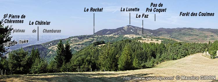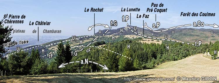 B/ Du côté septentrional l'extrémité de la dalle urgonienne de la Forêt des Coulmes correspond au rebord méridional d'érosion de la boutonnière de Malleval (voir la page "Malleval"). Mais la large sinuosité qui affecte la dalle de l'Urgonien ne se retrouve pas exactement dans le dessin des plis que l'on observe à Malleval au niveau des calcaires du Fontanil. Plutôt que de résulter d'une modification horizontale de la structure il est plus vraisemblable que c'est là un phénomène de dysharmonie* entre niveaux plus ou moins massifs de la succession des couches.