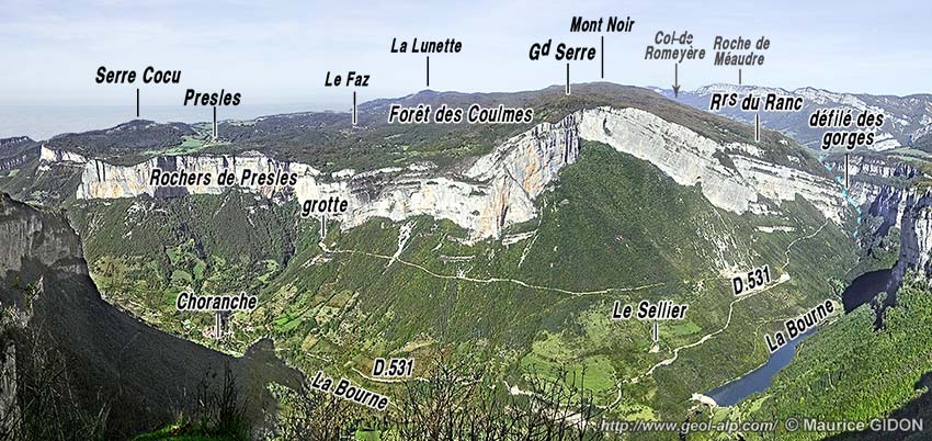 D/ Du côté méridional la forêt des Coulmes se termine net, tranchée par les abrupts urgoniens orientés W-E de rive droite de la Bourne (voir détails à la page "Bourne aval").