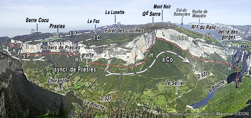 A/ Sur le bord ouest du domaine forestier, dans le vallon des Fauries, le pendage de l'Urgonien du flanc ouest de ce pli majeur s'atténue jusqu'à l'horizontale, puis il manifeste même un basculement vers l'est, ce qui définit un pli très ouvert (en fait plutôt coffré*), le synclinal de Presles. Peu au delà le tracé de la limite occidentale des affleurements urgoniens de la forêt des Coulmes correspond à une importante cassure N-S, la faille de Presles. Cette faille abaisse son compartiment oriental de plusieurs centaines de mètres, de sorte qu'au village de Presles même elle juxtapose la Lumachelle (qui affleure, à l'est de la faille, sous les maisons du village) à l'Hauterivien supérieur du versant oriental de la butte de Serre Cocu. Un sillon N-S colmaté d'alluvions ("La Plaine") souligne, au sud du village, la tracé de la faille. Il suit les affleurements de la Lumachelle, abaissée par la cassure, et se termine vers le sud par suite d'une remontée axiale du synclinal de Presles, qui fait réapparaître l'Urgonien du fond du pli.