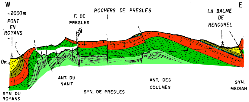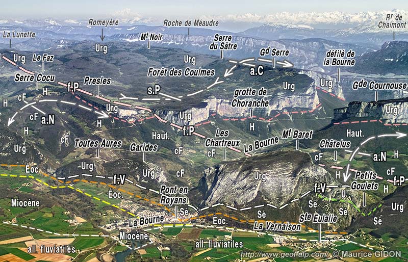 ![]() même fenêtre Coupe au nord du cours de la Bourne aval (par H. Arnaud) (couleurs comme sur la carte d'ensemble du Vercors) |