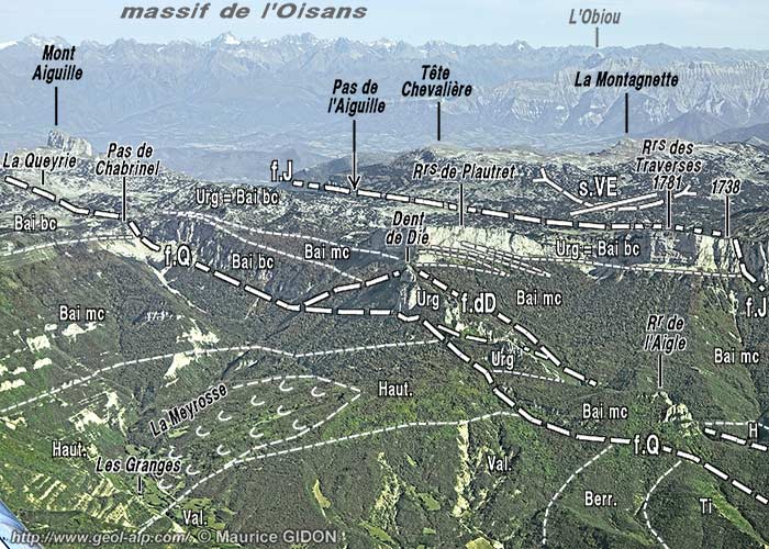 En outre il s'en détache des cassures secondaires induites par la friction du coulissement. La principale est celle qui limite du côté amont la Dent de Die puis le Rocher de l'Aigle. Cette lame rocheuse, assez disloquée dans le détail, est constituée de calcaires bioclastiques qui sont abaissés entre les deux lèvres des failles qui la limitent. Elle correspond à une navette* de coulissement, qui a été mise en saillie par l'érosion du fait elle est encadrée par des marno-calcaires (d'ailleurs plus anciens).