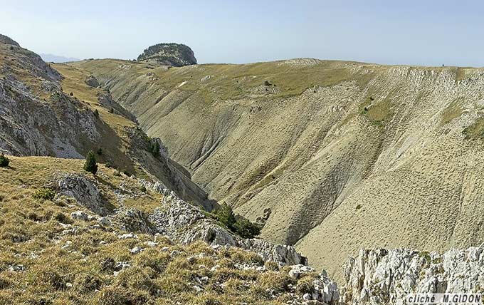 par l'érosion, qui y a creusé une profonde ravine.