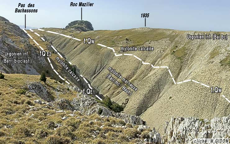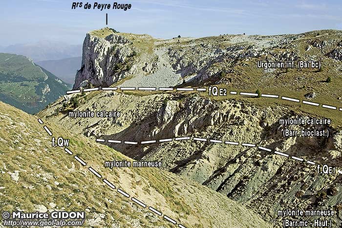 Ces compartiments intercalaires sont d'ailleurs bordés de chaque côté par une zone de mylonites calcaires. Du côté oriental la bande de mylonites est limitée par une faille secondaire (f.QE2 sur les photos) et son matériel est souvent assez fortement rubéfié : cette dernière caractéristique est certainement à l'origine du nom de "Peyre Rouge" donné aux rochers de la lèvre orientale de la faille de la Queyrie. |