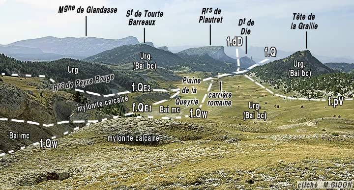 Vers le SE la faille de La Queyrie traverse tout le plateau urgonien, jusqu'à son rebord occidental qu'elle franchit au Pas de Chabrinel. Elle détermine au delà le long abrupt NE-SW qui limite le plateau au dessus du vallon de ce nom. Mais on la suit encore au-delà dans les pentes qui tombent sur le vallon de la Meyrosse, où l'importance pluri-kilométrique de son rejet horizontal est mise en évidence par le fait que les couches du Barrémien de sa lèvre orientale se juxtaposent successivement à des termes stratigraphiques de plus en plus bas, jusqu'au jurassique, de sa lèvre occidentale.