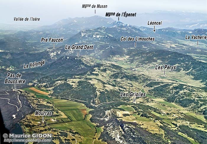 Plus au sud il se transforme progressivement, par réduction de la flèche de ses plis, en un grand plateau, bordé à l'ouest d'escarpements urgoniens suffisamment modestes pour que plusieurs routes les franchissent pour y accéder. Il y a d'ailleurs à cela une cause d'origine sédimentaire qui est le fait que les calcaires urgoniens proprement dits perdent beaucoup de leur épaisseur à la faveur du développement des faciès marno-calcaires dans les niveaux les plus anciens (qui ont été rapportés globalement ici au Barrémien inférieur) .