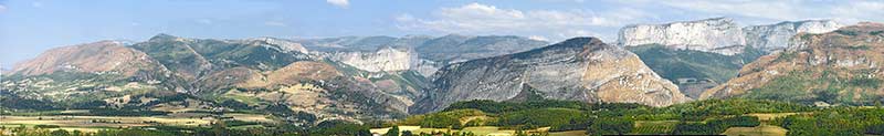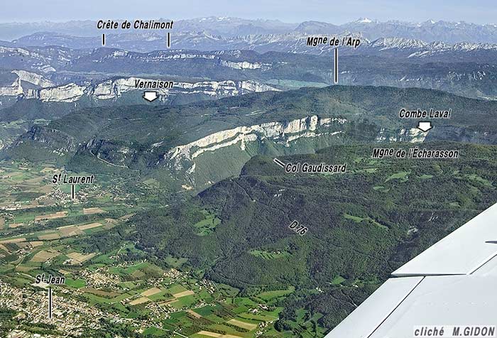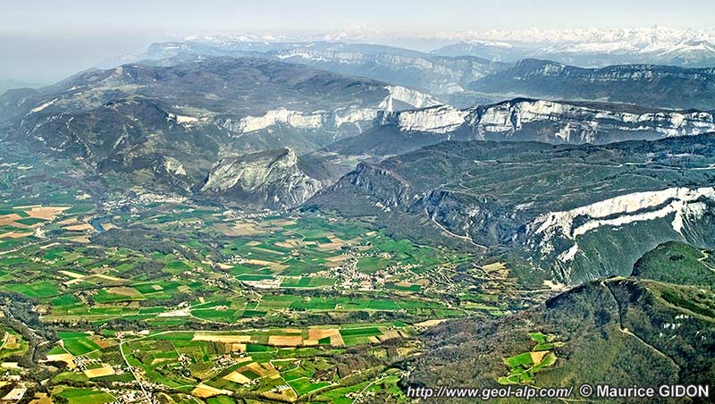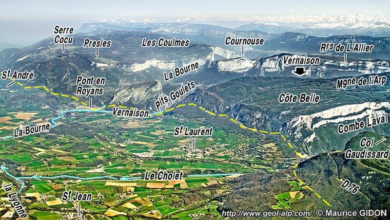 Vu de l'ouest le rebord oriental de cette dépression du Royans apparaît comme une barrière d'escarpements, simplement encochée par les débouchés des gorges de la Bourne et de la Vernaison, qui s'échapppent du Vercors proprement dit. (voir la page "Pont en Royans").