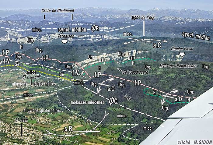 Toutefois si l'on considère la structure observable au revers oriental de cette barrière, il s'avère que l'on ne peut pas considérer qu'il y ait un véritable prolongement de ces deux plis l'un par l'autre (et qu'ils semblent plutôt se relayer au prix d'un décalage dextre). |