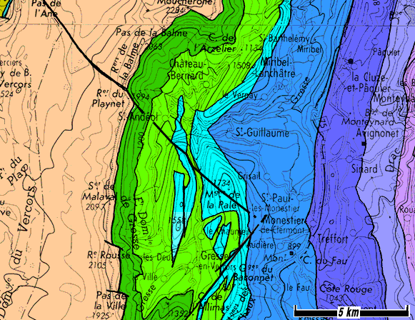Carte géologique très simplifiée du rebord oriental du Vercors au nord de Gresse