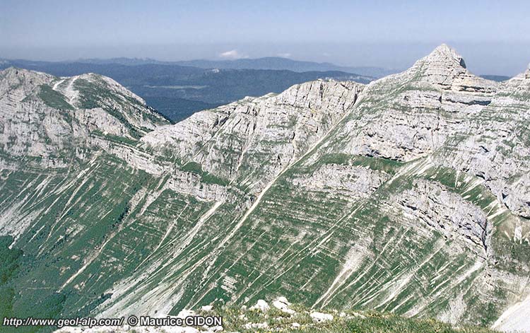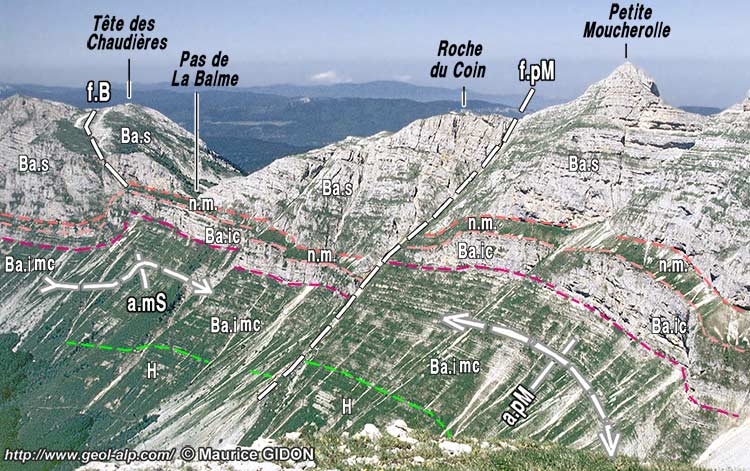 ![]() Le versant oriental du Pas de La Balme, vu du SE depuis la montagne de la Pale, au nord de Gresse. f.B = faille de la Balme |