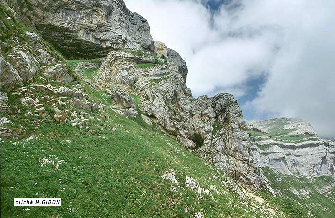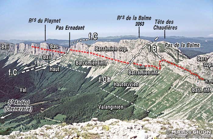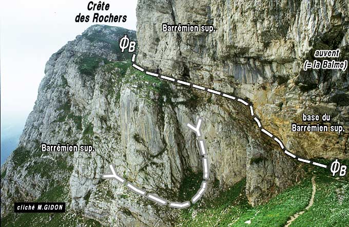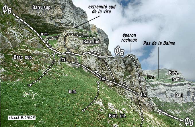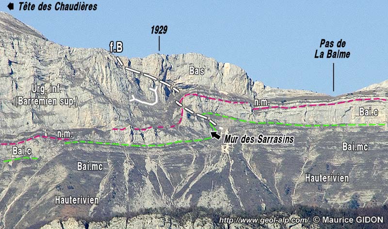 Cette structure se complète en outre par une cassure chevauchante qui s'embranche vers le haut à l'extrémité sud de la Balme et qui redouble la barre calcaire de la partie basse du Barrémien supérieur. Il semble qu'elle prenne naissance en rompant également (mais avec un bien moindre rejet) la charnière anticlinale du pli du Mur des Sarrasins.