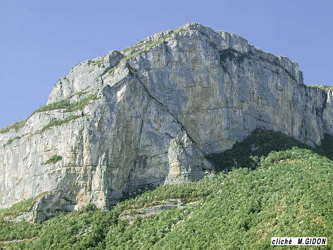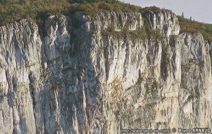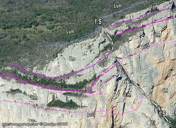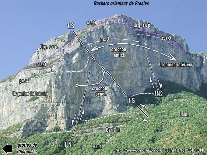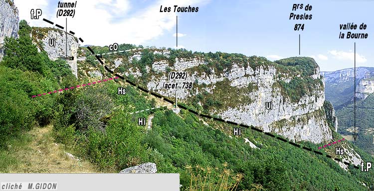![]() Le rebord méridional du plateau de Presles vu de l'ouest, depuis le lacet occidental de la D292 (pied de la falaise école d'escalade des Rochers occidentaux). f.P = faille de Presles. La falaise correspond au miroir de faille, à peine retouché par l'érosion. Les tirets rouges, repères de la base de l'Urgonien, permettent d'apprécier le rejet vertical de la faille. Hs = marno-calcaires à panopées, d'âge Hauterivien terminal ; c.O = couches à Orbitolines "inférieures", d'âge aptien inférieur). Il est à remarquer que la falaise urgonienne du compartiment gauche (portant les tunnels) n'atteint qu'une hauteur inférieure à 100 mètres, nettement plus faible que celle de la lèvre orientale : cette différence est due au décalage sénestre créé par le jeu anté-Miocène de la faille de Presles (la zone à Urgonien réduit se retrouve sur la lèvre orientale 4 km plus au nord, au village du Faz). |