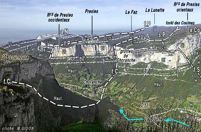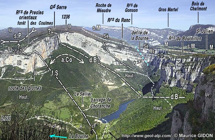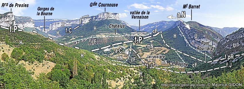 ![]() La vallée de la Bourne en amont de Pont-en-Royans vue du nord-ouest depuis le col de Toutes Aures f.C = faille de Choranche ; f.P = faille de Presles ; a.C = anticlinal des Chartreux ; f.J = faille de Jarrassière ; f.pR = faille du Pont Rouillard ; a.N = anticlinal du Nant. N.B. : Sous le sommet de la Grande Cournouse (à l'emplacement de la lettre "U") la dalle urgonienne se montre affectée par une perturbation tectonique de ses couches : ce curieux détail est représenté avec un fort agrandissement sur le cliché de la fin de la présente page. |