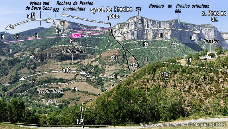 ![]() La rive droite de la Bourne en aval de Choranche vue du sud, depuis le col du hameau de Méselier (près de Chatelus). a.N = anticlinal du Nant ; a.C = anticlinal des Chartreux ; f.P = faille de Presles : son tracé oblique (tiretés espacés) est dû à ce que sa traversée par la Bourne lui fait décrit un "V topographique" pointant vers l'est. La partie orientale des rochers de Presles (points 874 et 905) est formée par de l'Urgonien pratiquement horizontal entre les deux flexures (ouest et est) qui délimitent le fond du synclinal de Presles. La portion d'abrupt comprise entre le point 874 et le tracé de la faille de Presles correspond à un rentrant orienté presque N-S : elle représente, à peu de chose près, l'abrupt de faille dégagé par l'érosion : l'inclinaison des couches qui s'y dessine est en partie due au plongement axial du fond du synclinal de Presles (cf. cliché précédent). |