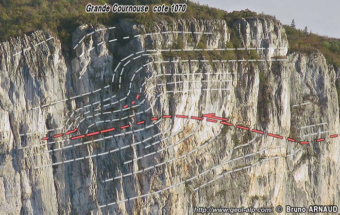 Détail de la disposition des couches urgoniennes dans les falaises nord-occidentales de la Grande Cournouse (voir localisation sur l'avant-dernier cliché de la présente page) (cliché original obligeamment communiqué par M. Bruno ARNAUD). Il s'agit de plis mineurs représentant sans doute les crochons* associés à un petit chevauchement (représenté en tirets rouges). Ces déformations s'accompagnent de variations d'épaisseurs qui sont vraisemblablement dues à un fonctionnement syn-sédimentaire, peut-être à rapprocher de celui de la faille de Sellier (voir plus haut). (cette curieuse structure m'a été signalée par l'auteur du cliché : à ma connaissance elle n'a pas été signalée antérieurement). |
