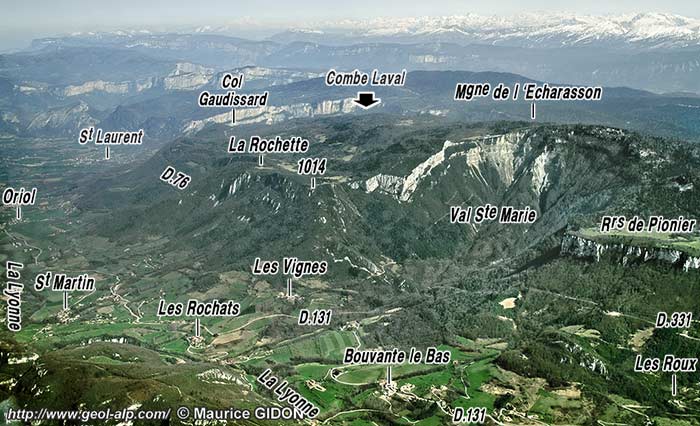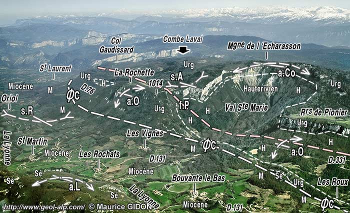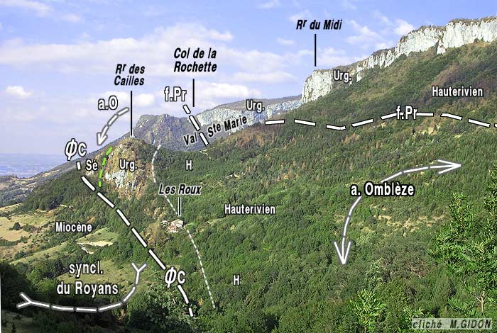 L'accident du col de la Croix n'est pas un simple chevauchement car, de part et d'autre de son tracé, l'anticlinal d'Omblèze change d'ampleur (il est beaucoup plus large du côté sud-est). D'autre part le prolongement de cette cassure vers le sud-ouest traverse la forêt de Léoncel et se poursuit par la faille de la Vacherie, qui traverse le synclinal de Léoncel peu au sud de cette localité et dont le caractère de déchirure coulissante est assez évident (voir la page "Léoncel"). Enfin cette interprétation en décrochement s'accorde bien avec le pendage très fort de sa surface de cassure. |