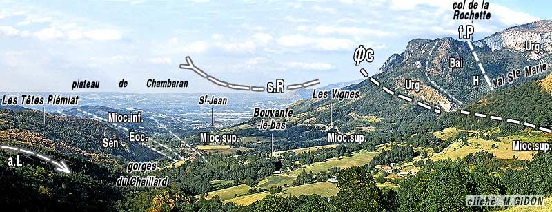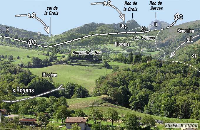 Le village de Bouvante-le-Bas est construit sur des affleurements miocènes du synclinal du Royans, ici larges encore de près de 1 kilomètre. Mais ces derniers appartiennent au flanc ouest du synclinal du Royans et se terminent deux kilomètres plus au sud au pied du col de la Croix, sectionnés en biseau par l'accident de la Croix.