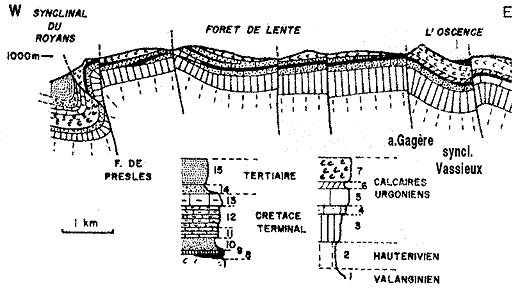 1. Marnes valanginiennes ; 2. Calcaires argileux et marnes de l'Hauterivien ; 3. Calcaires argileux du Barrémien tout-à-fait inférieur ; 4-7 = Barrémien inférieur calcaire, formant falaise : 4. Calcaires lités à petits débris ou à silex ; 5. Calcaires bioclastiques lités ; 6. Calcaires dolomitiques ; 7. Calcaires à Rudistes . |