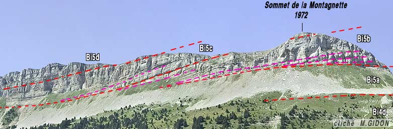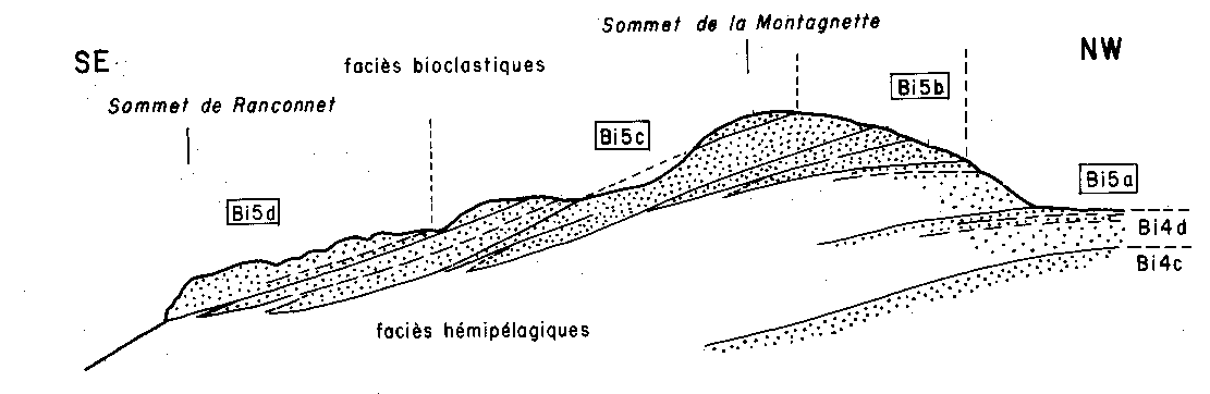 ![]() analyse de détail des intrications de couches des falaises orientales de La Montagnette (extrait de ARNAUD 1981). L'étude stratigraphique de la région a montré que le sommet du Barrémien inférieur correspond à une séquence majeure, appelée ici Bi5 (appartenant au sommet de l'ensemble "Ba1" de ARNAUD 1994 et 2005)**. On peut ici la subdiviser en plusieurs membres secondaires (a, b, c, d). L'examen de détail montre que la limite inférieure des calcaires de la Montagnette n'est pas une surface plane et qu'elle globalement oblique aux surfaces de strates : elle correspond en réalité à des indentation entre les bancs de calcaires bioclastiques, qui se terminent vers la gauche en biseau à tour de rôle dans les faciès plus marneux (hémipélagiques). De droite à gauche la base des faciès calcaires se situe donc de plus en plus haut dans la succession des strates : elle n'est pas "isochrone" d'un point à un autre et ne saurait être assimilée à une limite de sous-étage (au contraire des membres Bi5d, c, b, a et Bi4d). La géométrie résultante témoigne d'une progradation* vers la gauche (vers le sud-est) des faciès bioclastiques issus de la plate-forme urgonienne, puisque chaque membre bioclastique se termine plus loin que le précédent dans cette direction. ** pour plus d'explications sur les annotations stratigraphiques se reporter à la page spéciale |