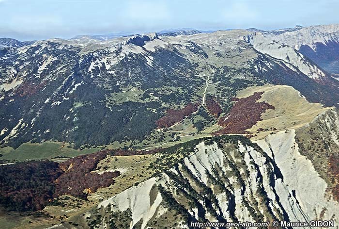 ![]() Les confins du Vercors et du Diois oriental vus du sud, d'avion, depuis l'aplomb de Glandage. Opposition entre les plateaux (enneigés) des calcaires bioclastiques du Glandasse (dont le bord méridional est entaillé par le cirque d'Archiane et la vallée de Combau) et les douces crêtes boisées d'avant-plan, entaillées dans les faciès marno-calcaires du même âge. Dans la vallée de Borne le Barrémien basal montre le développement de calcaires bioclastiques inconnus plus au nord : ces niveaux témoignent de la présence d'un haut-fond précoce, localisé à ce secteur, à une époque où il n'en existait pas encore en Vercors méridional. |