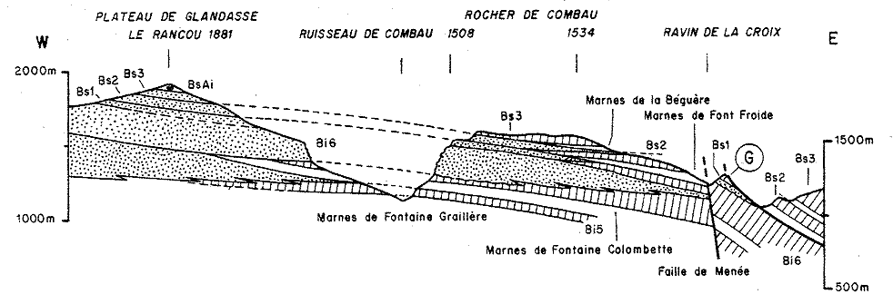 ![]() Coupe transversale aux gorges de Combau, à peu près conforme à la vue du cliché ci-dessus. (extrait de ARNAUD 1981) ; N.B. le terme de "Plateau de Glandasse" désigne seulement la partie de celui-ci située à l'est d'Archiane. Noter la terminaison en biseaux vers le sud-est des calcaires bioclastiques (figurés en pointillés) pour plus d'explications sur les annotations stratigraphiques se reporter à la page spéciale |