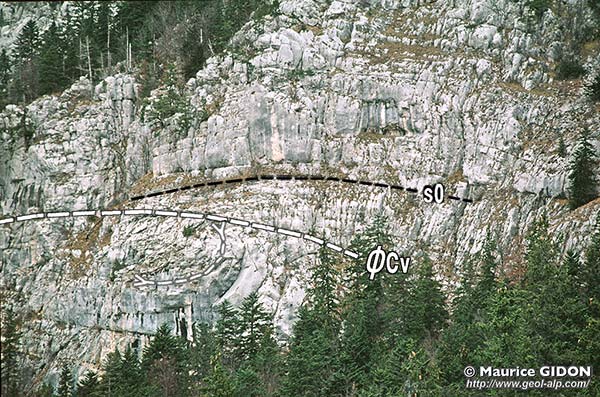 du pied des pistes. Il s'agit d'un abrupt de faille, dans lequel on distingue, en section, une ébauche de chevauchement de Combeauvieux (ØCv) à vergence* ouest, au sein même des couches urgoniennes (s0 =stratification). Le crochon qui se dessine sous la surface de chevauchement a un axe presque N-S, ce qui témoigne de la vergence* ouest de ce cisaillement. |