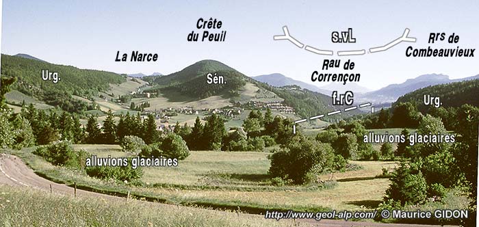 Cette situation ne se prolonge pas au sud-est du talweg du ruisseau de Corrençon car ce qui affleure au sud-est sur sa rive droite dans l'axe d'allongement du crêt sénonien du Peuil est constitué par de l'Urgonien qui forme l'échine des Rochers de Combeauvieux ; celle-ci est en outre orientée un peu moins N-S et ses couches sont au contraire pentées vers le NW, c'est-à-dire en sens opposé. Le vallonnement qui draine la dépression correspond en fait à une discontinuité structurale qui comporte plusieurs aspects.