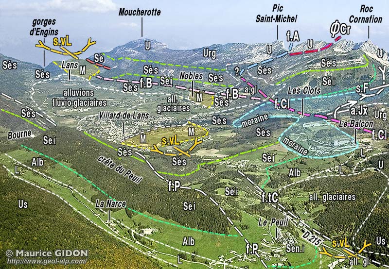 ![]() Le val de Lans et le chaînon le plus oriental du Vercors vus du sud-ouest, d'avion, depuis l'aplomb sud de Corrençon. On a représenté en bleu les amas morainiques abandonnés par la langue glaciaire qui descendait dans le vallon de la Fauge (à droite hors du cliché) à la fin du Würm et en jaune les affleurement miocènes. s.vL (en jaune) = synclinal du Val de Lans ; son flanc oriental est accidenté par les deux plis Jx = anticlinal des Jaux et s.F = synclinal de la Fauge. On voit que leurs axes plongent sous la cuvette du Val de Lans : la cause en est que cette cuvette post-miocène correspond à l'extrémité méridionale du grand synclinal méso-subalpin, qui est orienté N45, donc obliquement à ces plis orientés N10. f.P = faille du Peuil ; f.tC = faille du torrent de Corrençon ; f.Cl = faille des Clots. Les accident d'arrière-plan : f.B = faille des Blancs ; f.A = faille de l'Arc ; ØCr = chevauchement des Crocs, sont étudiés aux pages "Lans", "Pic Saint Michel" et "Col de L'Arc". |
