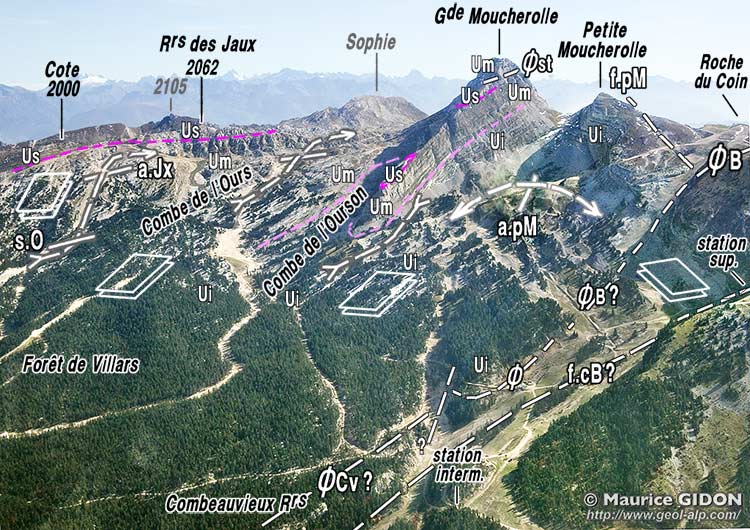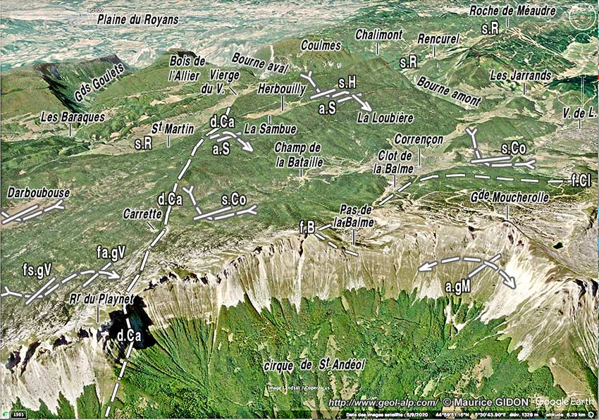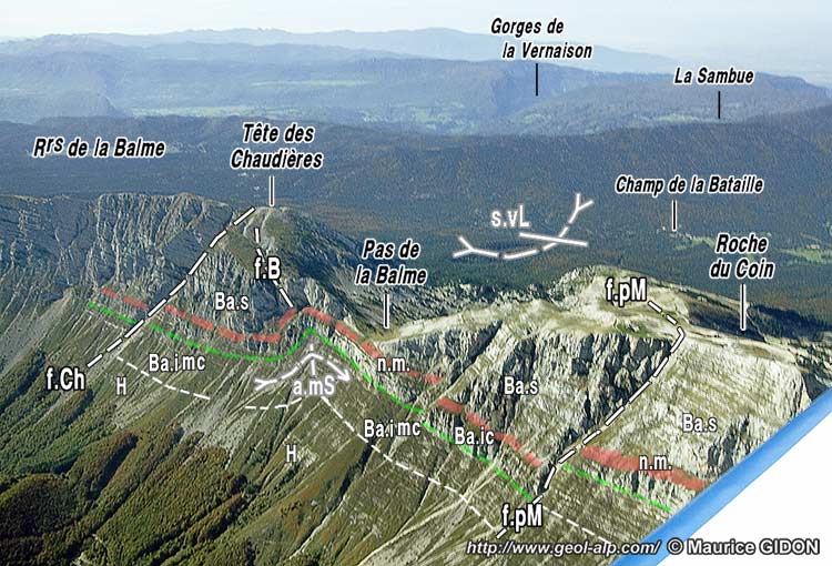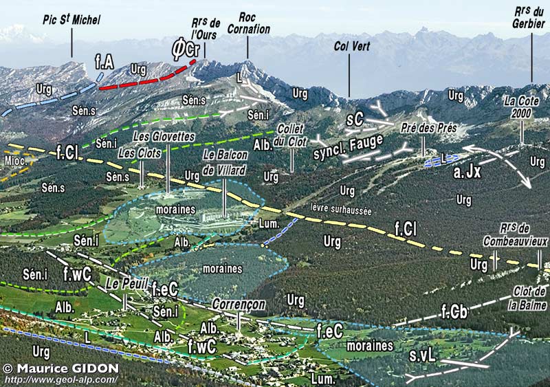 En fait ces pentes sud-orientales de Corrençon, qui appartiennent au flanc ouest de l'anticlinal de la Grande Moucherolle, s'élèvent de façon assez déclive, mais régulièrement et en concordance globale avec le pendage des couches urgoniennes, jusqu'à atteindre la crête de partage des eaux avec le bassin de la Gresse dans le secteur des Rochers de la Balme. Mais on ne dispose pas de données suffisantes pour penser que le chevauchement de Combeauvieux puisse en atteindre la crête en s'y raccordant à la faille de la Balme : c'est est en tous cas le seul accident à possèder là, comme voulu pour cela, le caractère chevauchant vers le SW.