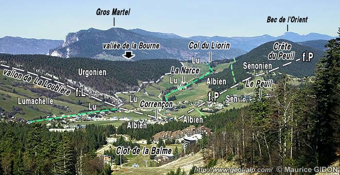 Ceci se manifeste clairement en remontant la route D 215, qui conduit de Villard-de-Lans à Corrençon. Cette dernière remonte le cours du torrent de Corrençon parallèlement à son cours, qui s'élève moins rapidement que ne le fait l'axe de la charnière du synclinal de Villard-de-Lans ; de ce fait elle coupe de haut en bas, toute la succession des couches du Sénonien, pour déboucher, au droit du Peuil, dans la dépression suspendue de Corrençon où affleurent les marnes albo-cénomaniennes. |