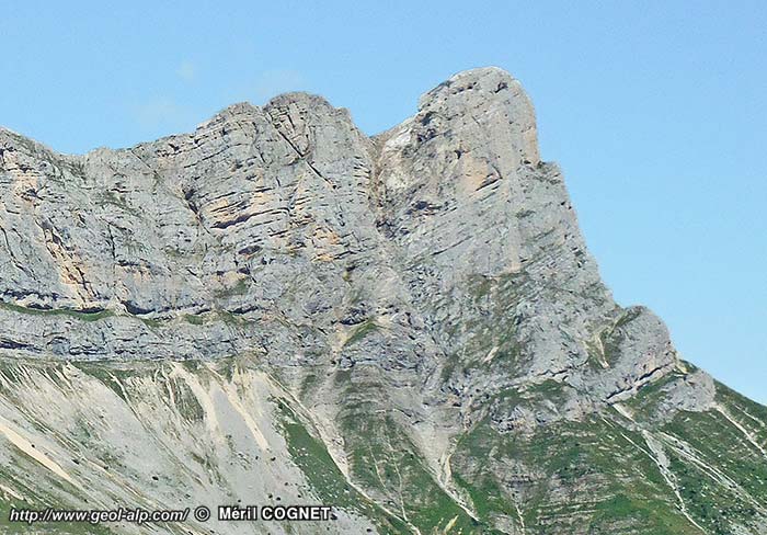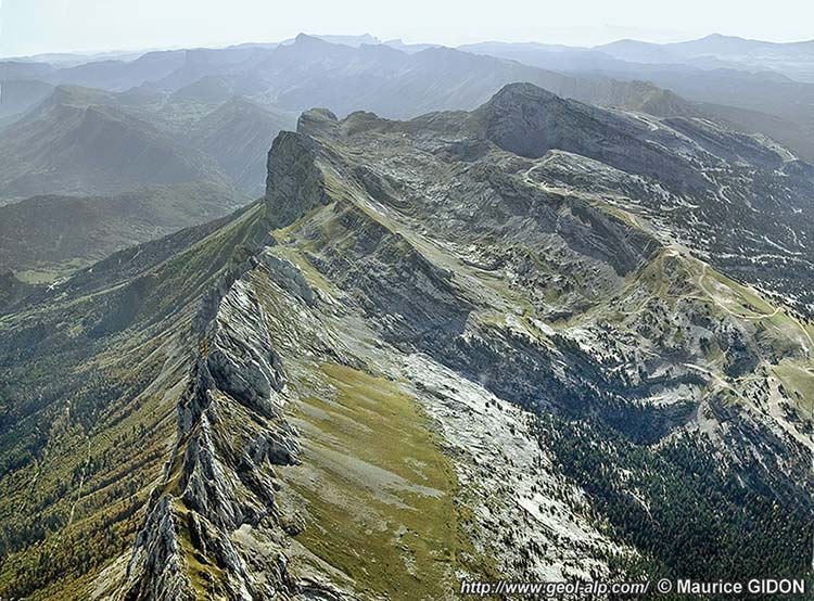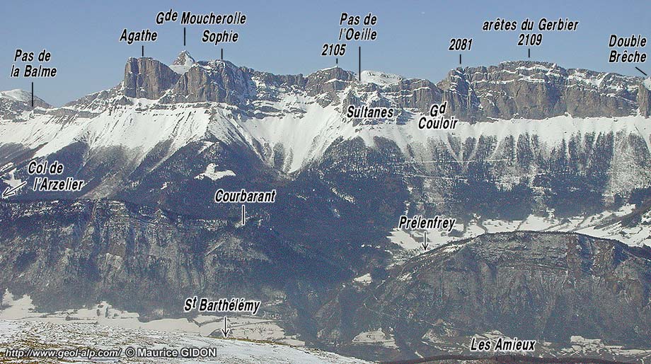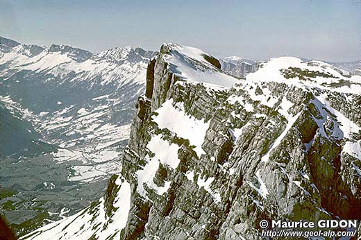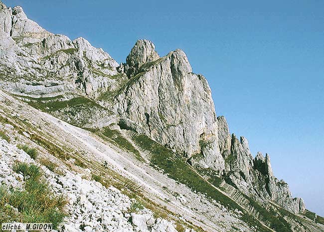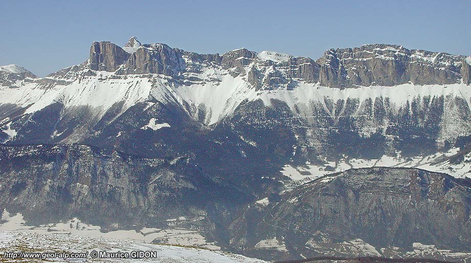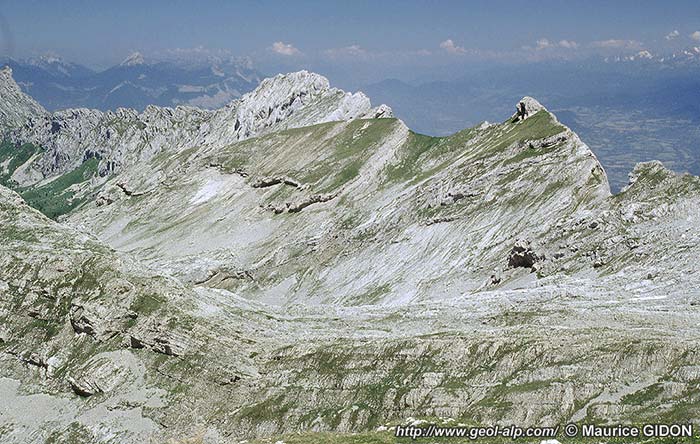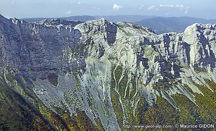La barrière orientale du Vercors septentrional dessine un promontoire saillant vers le sud au delà duquel s'ouvre l'extrémité septentrionale de la dépression de la Gresse (voir les pages "Rochers de la Balme" et "Moucherolle"). Cette ligne de falaises est celle d'un crêt* presque typique, qui regarde vers la vallée du Drac (vers l'est) et qui est armé par les couches urgoniennes, pentées en moyenne à 35 - 40° vers l'ouest, c'est-à-dire vers l'intérieur du massif (en général elles appartiennent à la seule masse urgonienne inférieure, la masse supérieure ayant été enlevée par l'érosion).