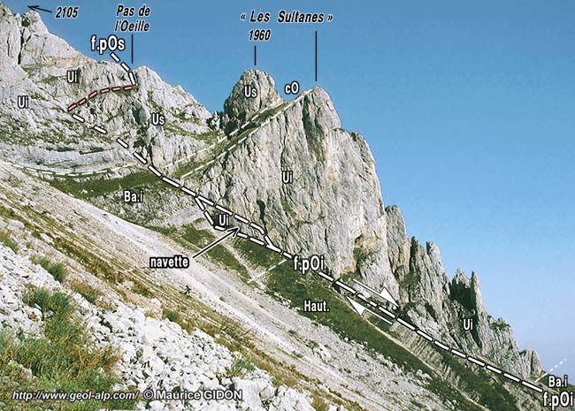 Or, dans les abrupts sud-orientaux du Pas, le tracé de la faille vers le bas est bien visible et s'avère orienté presque orthogonalement à la ligne de crête. Ceci est lié à l'orientation transverse qui est celle des abrupts méridionaux des Aiguilles des Sultanes au pied duquel l'érosion le met à nu. Mais cela n'explique pas pourquoi ce tracé ne se poursuit pas vers le haut en traversant la crête aux alentours du point coté 2105.