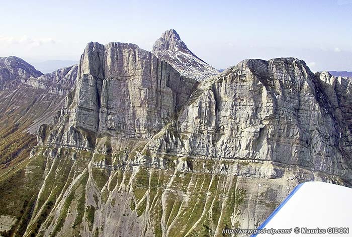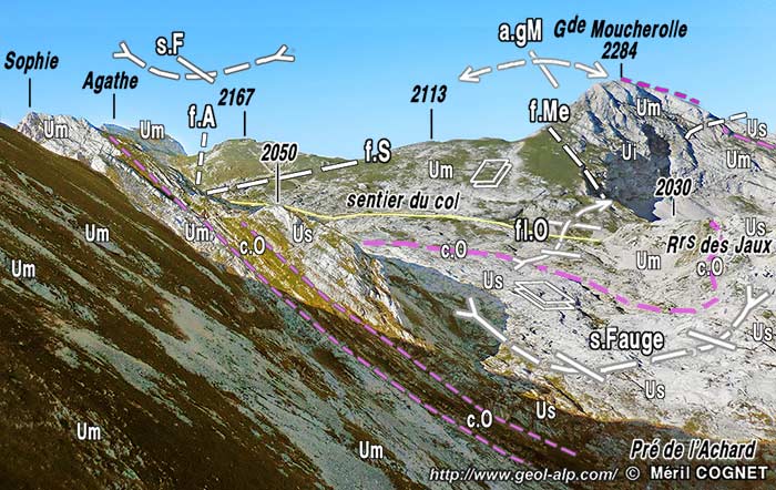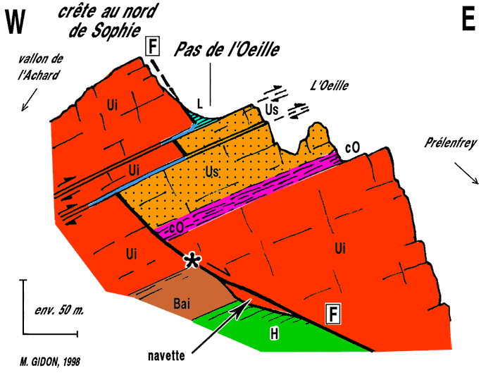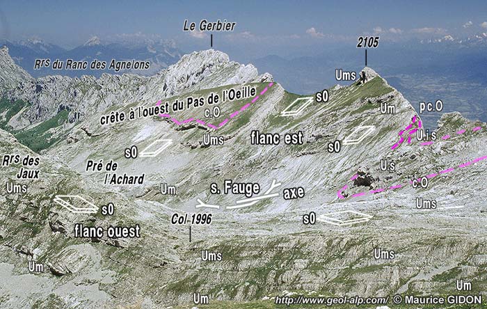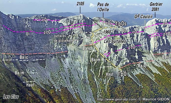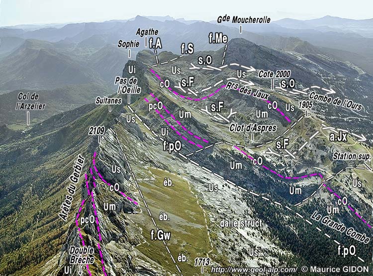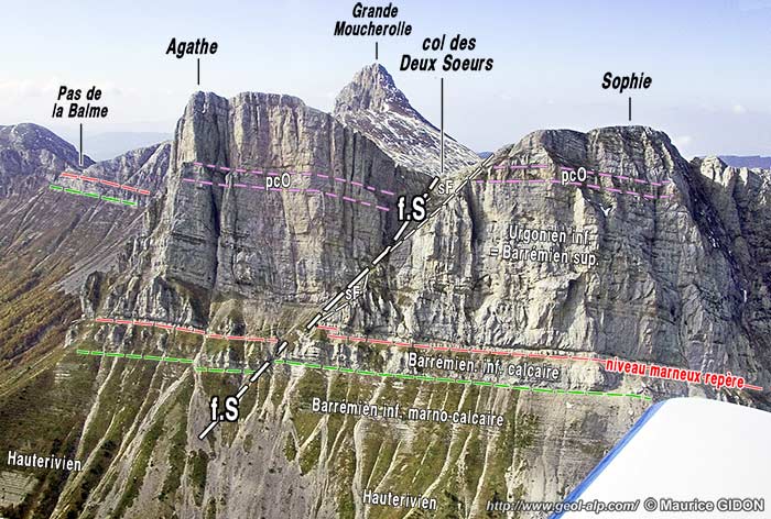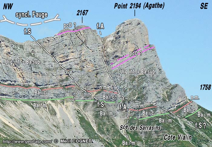 La plus proche du sommet ("faille d'Agathe") détermine un couloir très proche de la verticale, son tracé est sensiblement N-S et la lèvre orientale abaissée de plusieurs dizaines de mètres. Compte tenu de l'inclinaison de sa surface de cassure et du pendage vers le nord des couches induit par le plongement axial du synclinal de la Fauge il est plausible que son rejet vertical traduise en fait un jeu en décrochement dextre. La seconde, extensive et inclinée vers le SE, présente toutes les caractéristiques (y compris son tracé, orienté N75, repérable sur le plateau urgonien) pour être la réapparition de la faille du Col des Deux Sœurs. Elle se perd vers le bas en rejoignant le tracé de la faille d'Agathe. Or on retrouve un tracé similaire affectant la partie basse de la lèvre orientale de cette dernière. Compte tenu des orientations obliques de ces deux cassures il ne semble pas interdit d'envisager que cela résulte d'un décalage dextre de "f.S" par le jeu de "f.A". |