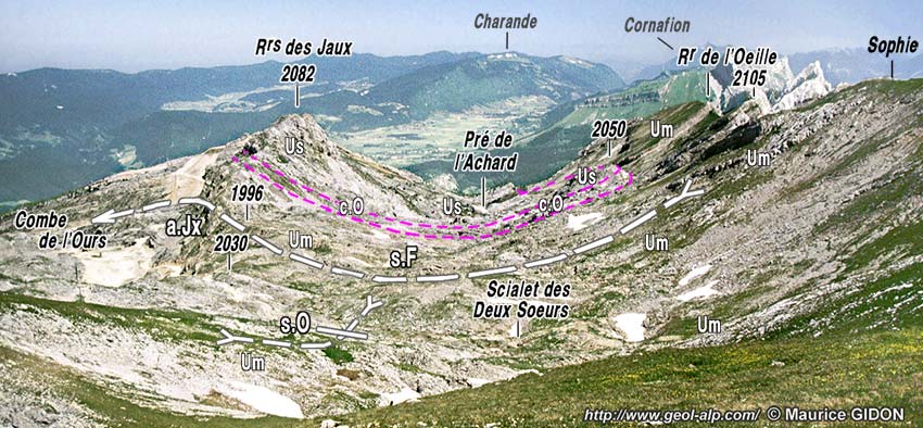 Toutefois, dans cette partie la plus méridionale, le fond de ce synclinal est dénudé jusqu'à l'Urgonien du fait que le pendage de son axe est plus fort que la pente topographique de son val. D'autre part il y ne s'y dessine que de façon confuse en raison de son interférence avec les autres structures et notamment avec la flexure synclinale de la Combe de l'Ours, qui lui est oblique (voir la page "Moucherolle").