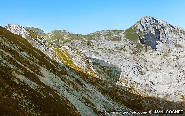 L'extrémité septentrionale de ce promontoire, où l'orientation de la falaise urgonienne devient E-W de part et d'autre de la Grande Moucherolle (voir la page "Moucherolle"), est constituée par les Rochers des Deux Sœurs.