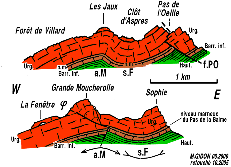 a.M = anticlinal des Jaux (charnière orientale de la coupole de la Grande Moucherolle) ; s.F = synclinal
