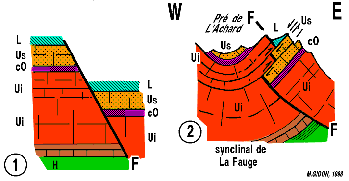 Il est en outre logique de penser que ce dernier a dû être occasionné par le plissement qui a créé le synclinal de la Fauge, ceci postérieurement au jeu extensif de la faille.
