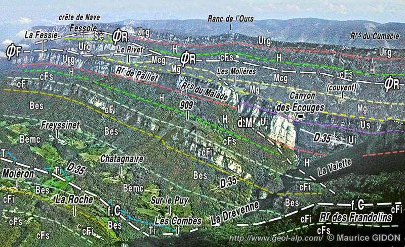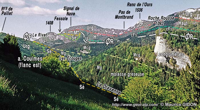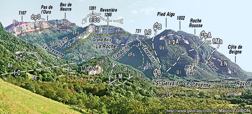 ![]() La coupe naturelle de la vallée de la Drevenne vue du nord, depuis les pentes de La Chapelle de Saint-Gervais. d.pO = décrochement du Pas de l'Ours a.Co = anticlinal des Coulmes ; s.M = synclinal du Moléron ; a.N = anticlinal du Nant ; a.Co = anticlinal des Coulmes ; f.C = faille des Combes ; ØB = chevauchement des Belles ; a.pA = anticlinal de Pied Aigu ; ØpA = chevauchement de Pied Aigu ; f.Ma = terminaison septentrionale de la faille de Marandière (voir la page "Cognin") : cette cassure extensive rehausse la partie basse du flanc ouest de l'anticlinal du Nant (la Côte de Beigne). |