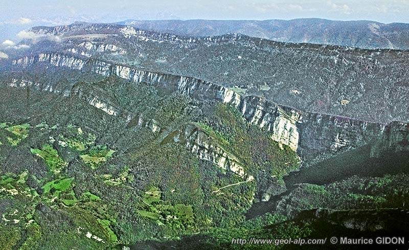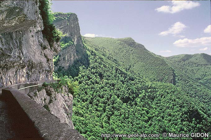 ![]() Le canyon des Écouges, vu de l'ouest, depuis la route D.35, au tournant du Cadet. N.B. : les couches dérives un "V topographique"* qu'accentue la perspective en contre-plongée (cela fait notamment croire que la route et les strates s'élèvent de gauche à droite (alors qu'elle descendent dans ce sens). |
