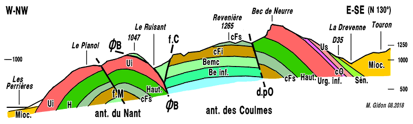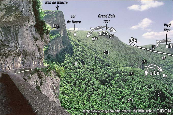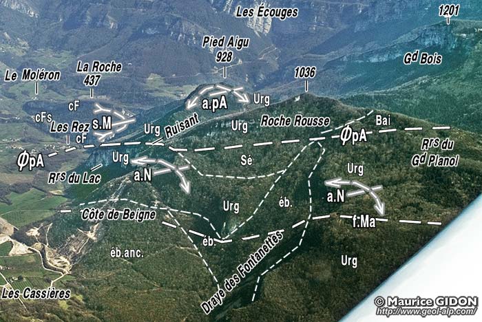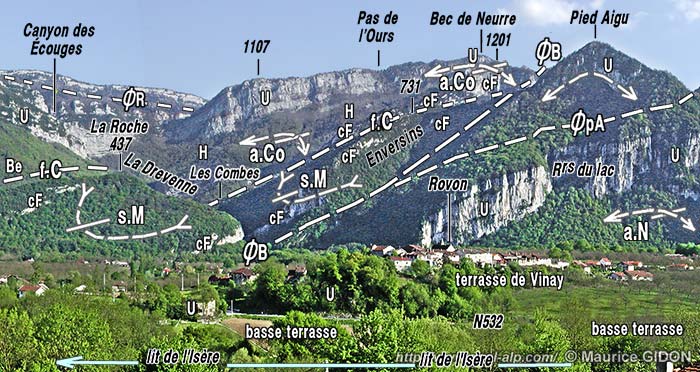 a) Le flanc oriental de l'anticlinal du Nant s'enfonce, comme au nord de Malleval, par l'intermédiaire du chevauchement des Belles, sous les couches plus récentes, qui sont ici les calcaires du Fontanil formant les Rochers des Enversins. Mais plus au nord, au revers est de Pied Aigu, le chapeau urgonien de la voûte de l'anticlinal du Nant est en quelque sorte redoublé par un chevauchement de Pied Aigu, que l'on peut sans doute considérer comme une imbrication secondaire induite par le chevauchement des Belles.