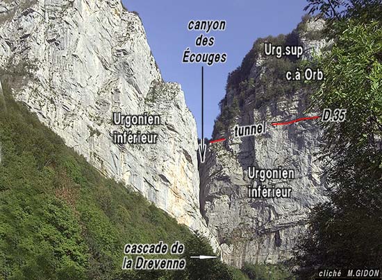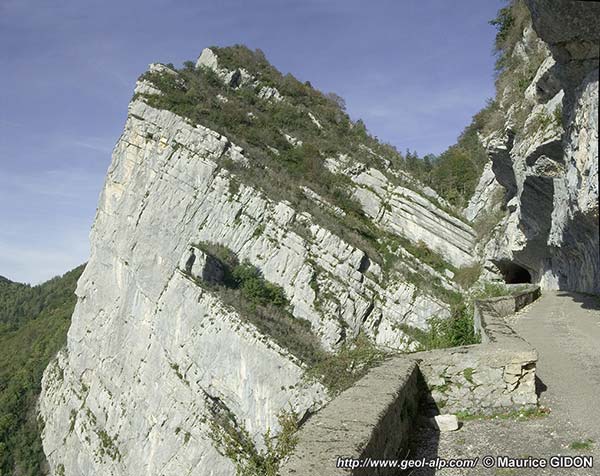 Venant du col de Romeyère la D.35 s'engage d'abord dans cette entaille à son sommet. Puis elle s'en échappe par le vertigineux encorbellement du Balcon des Écouges qui traverse en diagonale la falaise urgonienne, verticale sur près de 300 m de haut, en suivant pratiquement un seul niveau de strate. Ses constructeurs ont en effet utilisé, à plusieurs reprises, une même surface de strate, en la dégageant par en-dessous, pour former un toit protecteur au dessus de la chaussée (ou en creusant par dessous pour l'agrandir, là où ce surplomb avait déjà été dégagé par l'érosion naturelle).