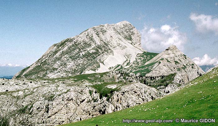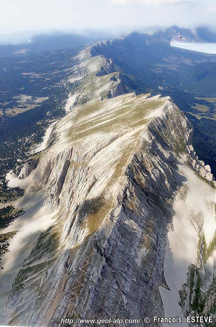Si le Grand Veymont domine cependant ce plateau oriental du Vercors de plus de 500 m, c'est à la faveur d'un redressement accentué du pendage qui y affecte les couches de la dalle urgonienne. Celles-ci dessinent en effet, au pied occidental de la montagne, une charnière synclinale ouverte vers l'ouest. puis ébauchent ensuite un début de voûte anticlinale, aux abords du sommet de la crête mais tout ceci sans changement du sens de pendage des couches (ce type de géométrie est qualifié de flexure monoclinale*). En fait on observe là ce que l'érosion a respecté sur cette transversale du flanc ouest du gros anticlinal coffré de la grande Moucherolle (voir la page "Gresse"), dont la voûte urgonienne est ici complètement éventrée.