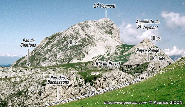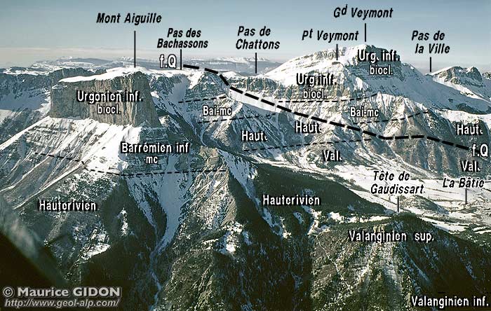 ![]() Le Grand Veymont vu du sud, depuis les Rochers du Parquet f.Q = faille de la Queyrie (dans le vallon du Pas des Bachassons, masqué par les prairies de premier plan). noter l'inclinaison plus accentuée des couches urgoniennes ("formation du Glandasse" bioclastique = Ui bc) au niveau du Pas de Chattons par rapport à la crête sommitale. |