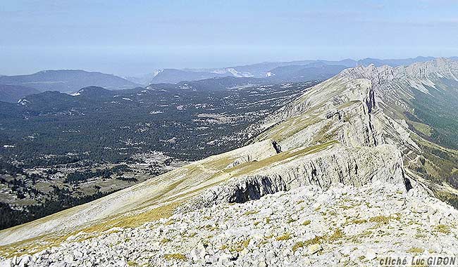 Le Grand Veymont, qui est le plus haut sommet du Vercors, n'est que le point culminant d'un long crêt* d'Urgonien. Ce crêt regarde vers l'est et domine de ce côté la dépression de Gresse, qui est sur cette transversale une simple combe monoclinale* ouverte dans les terrains à prédominance marneuse du Crétacé inférieur (voir coupe plus loin dans cette page).